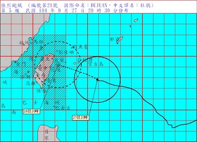 中央氣象局27日晚間20:30,針對宜蘭、花蓮、臺東(含蘭嶼、綠島)、台北、基隆、新北、桃園、新竹、苗栗、台中及南投地區發布警戒,應嚴加戒備並防強風豪雨。圖/中央氣象局提供