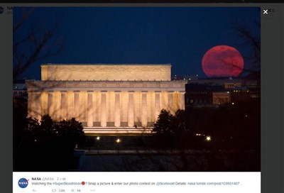 天文奇觀「超級月亮」和「月全食」同步登場,NASA在推特邀請民眾分享超級血月的照片。圖/取自NASA官方推特