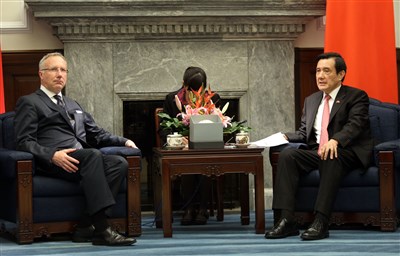 總統馬英九(右)今在總統府,接見美國貿易代表署副貿易代表何禮曼(左)訪華團。圖/中央社
