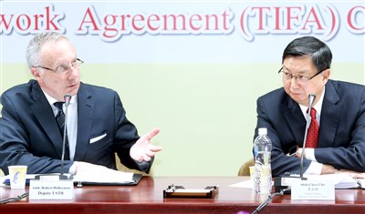 第9屆台美貿易暨投資架構協定會議落幕,雙方主談人經濟部次長卓士昭(右)與美國貿易代表何禮曼(左)針對美豬議題舉行記者會。圖/屠惠剛