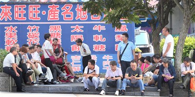 大批陸客聚集在台北用餐據點外,等待遊覽車將他們載到另一個景點觀光或消費,背後是受陸客青睞的台灣名產廣告。圖/侯永全