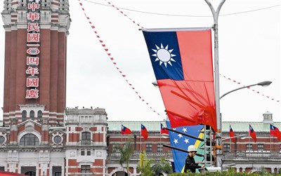 一○四年國慶大典今天在總統府前登場,工作人員昨天對周邊設備進行最後檢查,確保典禮順利進行。圖/余承翰