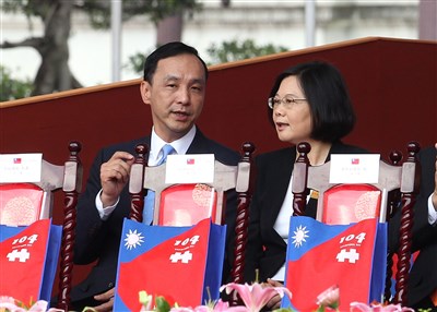 國慶大會上,國民黨主席朱立倫(左)與民進黨主席蔡英文(右)出席,兩人互動熱絡。圖/中央社