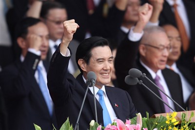 國慶大會中,總統馬英九(前)率領現場與會群眾高呼「中華民國萬歲!台灣民主萬歲!」。圖/中央社