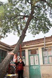 郭桂仙表示,這棵老樹一直是歪著長的,「從我嫁過來它就是歪的」,看上去就像要倒了一樣。1997年她家蓋平房時,老樹還距離屋簷10公分,現在已緊貼屋簷,有關單位還在樹下搭建支架。