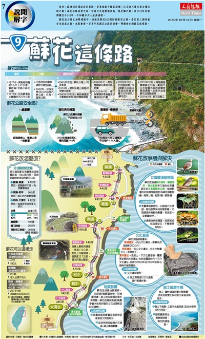 蘇花這條路 |2015.10.12 語音朗讀 1954觀看次 字級 大 中 小 蘇花這條路 蘇花這條路 前言:蘇澳到花蓮這段百里路,是東部遊子離家返鄉,以及旅人進出東台灣必經之路;蘇花沿路美景天成,但遇天災地變就成為一條災難之路。從1874年初始開闢至今141年,不知讓多少人血淚滿襟。 蘇花改公路正加緊建設中,這條花費近500億的新蘇花公路,是花東人期待能安全返家之路。本版整理一百多年來蘇花公路的演變,帶讀者走過蘇花這條路。 前一篇文章 諾貝爾獎 誰最亮 下一篇文章 孩子們,運動吧! 熱門新聞 01桌球年終賽激戰 林昀儒力爭晉4強2025.12.1202【閃文集】火星暗斑之謎2025.12.1603包錦蓉:我可以逆風高飛2025.12.1304普中鋁棒聯賽季軍獻獎 張育豪感恩母校栽培2025.12.1205佛光穿透鐵窗 佛光山監獄佈教 70 年2025.12.1306遠離初老&改善骨鬆的解方2025.12.1307日吃80顆帶皮花生 可護腦、降血壓2025.12.1208【詩】 航夢2025.12.1509Fed利率連3降 重啟QE購債2025.12.1210【為人父母】 允許如其所是2025.12.15 訂閱電子報 台北市 天氣預報 台灣一週天氣預報 相關報導 大學校名怎麼來? 作者其他文章優化大腦 自我實現心理投射現象解析從潮流到商機 流行文化吸引力困境中從容轉身莫迪會見普亭 盼俄烏戰爭盡快落幕面對災厄無常 善念可化解與修復