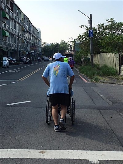【本報綜合報導】在臉書上擁有近19萬的網路紅人、號稱寶爺的梁嘉銘11日參加馬拉松賽事後,於個人臉書上PO出一張照片,畫面中只見一位男子推著另一位坐在輪椅上的女人一同參賽,梁嘉銘表示看到此畫面令他相當感動,當下便向他們打氣喊話,而照片上傳後也引起網友熱烈回應。