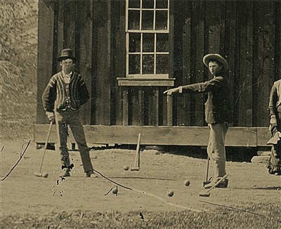 在這張1878年夏末拍攝的4x5吋錫版照片上,比利小子(左)和他的夥伴在玩槌球。 圖/取自網路