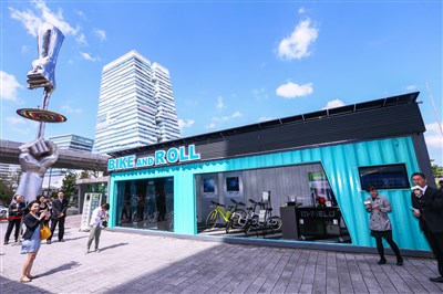 「台美雙方相關單位合作備忘錄」去年簽署,歷經一年時間,經濟部推動綠色貿易專案辦公室號召台灣綠色科技製造商研發「明日電站」,今天在南港展覽館啟動展示,電站上方的太陽能面板發的電,可供自行車租賃站運作與照明之用,既使用綠能,又能推廣減碳交通工具。