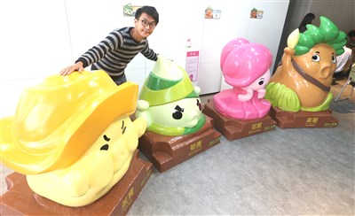 台科大設計系學生蔡亞典設計4種不同卡通造型的貓空小精靈「茶老、茶寶、筍青及花妮」大型公仔,希望藉此推廣貓空在地特色文化。圖/侯永全