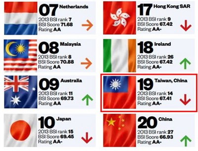 在2014年「全球百大國家品牌年度報告」中,台灣排第25名。圖/取自網路