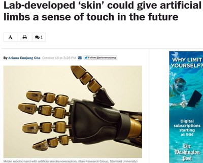 根據《華盛頓郵報》報導,這項技術運用彈性有機迴路,以及依施力大小轉換為數位訊號的專門壓力感測器。這種能套在機器手臂的人工皮膚可以分辨接收到的是輕觸、或是有力的握手。