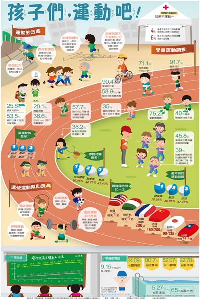 孩子們,運動吧! |2015.10.19 語音朗讀 1978觀看次 字級 大 中 小 孩子們,運動吧! 運動的好處多多,可以增強身體抵抗力、減少慢性疾病的發生率、紓解壓力;國外研究也指出,學童每天上一節體育課,對學業表現有正向幫助。然而,台灣中小學生平均每周只有約兩節體育課,遠低於美國、歐洲、日本或大陸;而放學後花在看電視、上網的時間,更比運動時間多出五到七倍;影響所及,四成六的小學生體重過輕或過重。本周就為大家呈現台灣學童的運動樣貌。 前一篇文章 蘇花這條路 下一篇文章 今天,空氣好嗎? 認識空氣汙染 熱門新聞 01桌球年終賽激戰 林昀儒力爭晉4強2025.12.1202【閃文集】火星暗斑之謎2025.12.1603包錦蓉:我可以逆風高飛2025.12.1304普中鋁棒聯賽季軍獻獎 張育豪感恩母校栽培2025.12.1205佛光穿透鐵窗 佛光山監獄佈教 70 年2025.12.1306遠離初老&改善骨鬆的解方2025.12.1307日吃80顆帶皮花生 可護腦、降血壓2025.12.1208【詩】 航夢2025.12.1509【為人父母】 允許如其所是2025.12.1510Fed利率連3降 重啟QE購債2025.12.12 訂閱電子報 台北市 天氣預報 台灣一週天氣預報 相關報導 大學校名怎麼來? 作者其他文章優化大腦 自我實現心理投射現象解析從潮流到商機 流行文化吸引力困境中從容轉身莫迪會見普亭 盼俄烏戰爭盡快落幕面對災厄無常 善念可化解與修復