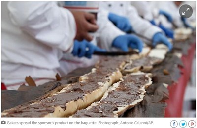 一確定打破世界紀錄,現場人員立刻把法國麵包切開,抹上能多益巧克力榛果醬,分給博覽會上數百名共襄盛舉的遊客。
