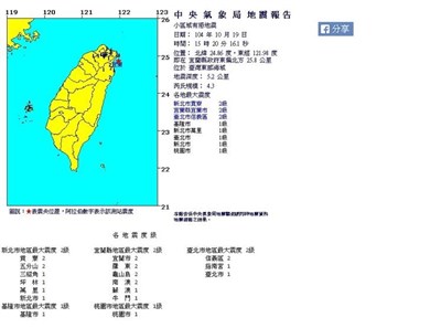 又震!15時20分再次發生規模4.3地震 |2015.10.19 語音朗讀 747觀看次 字級 大 中 小 圖/中央氣象局 【本報台北訊】15時20分台灣東部外海發生規模4.3地震,地震深度5.2公里,最大震度在新北市貢寮2級、宜蘭市2級;北北基桃等皆1級。 前一篇文章 全運會舉重 許淑淨復出摘金 下一篇文章 18%國庫年付815億 銓敘部:盼逐年下降 熱門新聞 01澳洲野火延燒 吞噬30萬公頃叢林2026.01.1202東京消防演練 秀古老打火絕技2026.01.1303【生活快門】無障礙鞦韆2026.01.0904佛光兒童奉茶 法水寺暖人心2026.01.0905搶太空資源 陸申報20萬顆衛星2026.01.1206【台灣媽媽在荷蘭】體驗阿爾卑斯山冬季魅力2026.01.1207福山寺贈吉祥公益米 送暖彰化社區2026.01.1208寬頻與光纖2026.01.0909【聊聊心裡事】 三次免費諮商,怎麼用最有幫助?2026.01.1010短時間運動 或對腸癌細胞有潛在作用2026.01.09 訂閱電子報 台北市 天氣預報 台灣一週天氣預報 相關報導 【星雲大師如是說】處事禪心【星雲大師如是說】人間佛教【星雲大師如是說】正信之美【星雲大師如是說】輪轉相繼【星雲大師如是說】有情的層次【星雲大師如是說】六忍歌