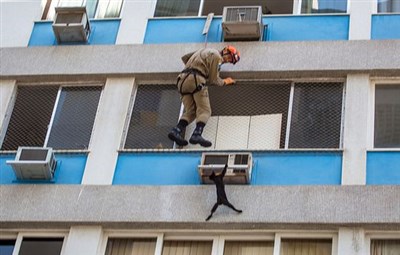 【本報綜合外電報導】好奇差點害死貓!在巴西的一隻黑貓掛在冷氣機下方,多虧消防員「串聯」救援,上演英雄救貓。