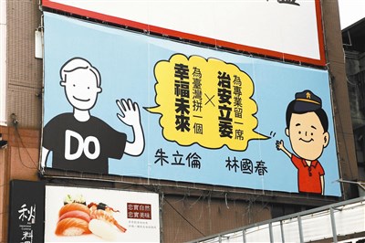 國民黨徵召黨朱立倫參選總統,各地競選看板也要調整,新北市板橋西區藍委候選人林國春趕在臨全會後的第一個上班日,昨天在新埔捷運站附近掛上第一面與朱立倫合體的的雙人Q版競選看板。圖/魏莨伊