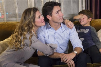 可望接任加拿大總理的杜魯道,19日晚間與妻兒在旅館觀看選情。圖/美聯社