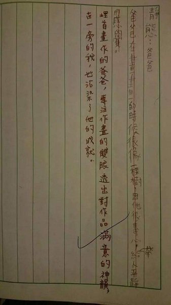 黃武雄在臉書上表示,這張照片是去年有人貼在臉書上的。照片中,可以看到學生寫了「爸爸在畫畫的時候很像一棵樹,因他很專心,帶給人平靜的感覺」的句子,描述爸爸。不過卻被老師用紅筆劃掉,並且用自己的話,寫上「埋首畫作的爸爸,專注畫作的眼神透露出對作品滿意的神韻,在一旁的我也沾染了他的成就」,再畫勾。