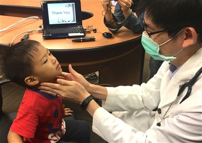 EB病毒症狀與感冒類似,但會出現扁桃腺有白色化膿滲出物以及脖子淋巴結明顯腫大等典型症狀,圖為醫師替孩童檢查。圖/江慧珺