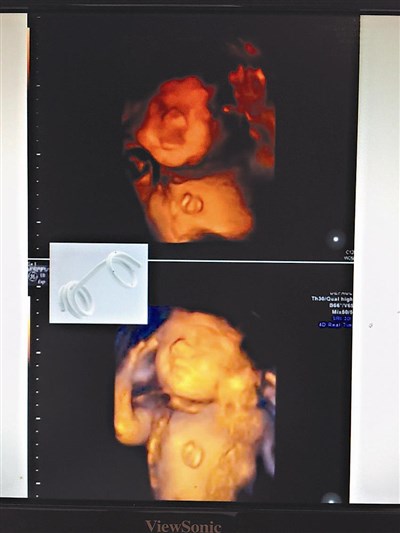 林口長庚醫療團隊利用超音波定位,將支架放在胎兒的體內,助胸水引流到羊水內。圖/陳雨鑫