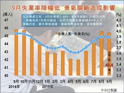 9月失業率降幅 7年新低 陳忠賢 |2015.10.23 語音朗讀 1065觀看次 字級 大 中 小 台北市街頭一間成衣店掛出結束營業的廣告招牌,並寫上「要退休了」,與行人稀少冷清的騎樓相對照,令人唏噓。圖/屠惠剛 主計總處公布九月失業率降幅為近七年同月最低,在初次尋職失業者減少五千人下,降幅仍低。圖/中央社 台北市街頭一間成衣店掛出結束營業的廣告招牌,並寫上「要退休了」,與行人稀少冷清的騎樓相對照,令人唏噓。圖/屠惠剛 主計總處公布九月失業率降幅為近七年同月最低,在初次尋職失業者減少五千人下,降幅仍低。圖/中央社 【記者陳忠賢台北報導】主計總處昨天公布九月失業率來到百分之三點八九,降幅為近七年同月最低,其中初次尋職失業者雖減少五千人,降幅仍低,顯示景氣趨緩、關廠等構成影響須持續觀察。另外,也公布了薪資調查,在扣除物價影響後,一至八月實質經常性薪資為三萬七千四百三十元,是十六年來最高增幅,也是近八年同期最高,但仍不如十五年前薪資。 在失業率的部分,若按教育程度別觀察,國中及以下程度者失業率為百分之二點七七;高中、職程度者為百分之三點八七;大專及以上程度者為百分之四點三一;其中大學及以上程度者為百分之五點零四。顯示學歷愈高失業率愈嚴重。若按工作年齡層觀察,十五到二十四歲失業率為百分之十二點六九最高;二十五到四十四歲則是百分之四點零六居次;另外四十五到六十四歲為百分之一點九七。 此外,對比亞洲四小龍的最新失業率,香港為百分之三點三,新加坡為百分之二,南韓為百分之三點五。台灣九月份的失業率,仍是四小龍中最高者。 主計總處分析指出,對照民國九十七年金融海嘯發生,曾長達七個月期間,每個月因為關廠失業人數增加一萬到五萬人,相對比前述累計三個月時間的人數高,因此景氣導致的關廠因素是否持續造成影響,須再觀察一段時間。 在薪資與生產力統計方面,今年一至八月平均薪資為五萬六百三十三元,扣除物價影響、以一百年價格衡量後為四萬九千零七十七元,都是歷年同期新高。而扣除物價影響後的一至八月實質經常性薪資比去年同期增加百分之二點零五,是十六年來最高增幅,也是近八年同期最高。 另外,今年八月平均工時為一百七十八點二小時,主計總處指出,因為八月上班天數少,所以比七月少了八點八小時;八月製造業平均加班工時為十五小時,比七月少零點五小時,也比去年同月小一點六小時。 前一篇文章 新聞千里眼 下一篇文章 基本工資調漲 曙光再現 熱門新聞 01祖厝大變身 王榮文打造農夫美術館2026.03.3102苗栗漁港冒藍眼淚 縣府將檢測水質2026.03.3103明德水庫蓄水量僅27% 今起供4停42026.04.0104【讓愛自由】纏繞與獨立之間2026.04.0205新生首次到校2026.04.0206星雲大師靈骨分燈日本 法燈長明2026.04.0107佛光會理監事會議 佛光精神深耕全球2026.03.31089公尺高恐龍 現身澄清湖2026.04.0109東京櫻花滿開2026.04.0110星雲大師靈骨分燈泰國 化益世人2026.04.02 訂閱電子報 台北市 天氣預報 台灣一週天氣預報 相關報導 台澎海空疏運高峰 逾8千人提前返台海軍敦睦艦隊 進入巴拿馬運河中油高雄大林廠火警 環保局開罰桃機3航廈屋頂 設10公里天溝國民黨中常會 提名台中、澎湖、竹縣長中美並重 鄭麗文傳6月訪美 作者其他文章禁建48年 社子島開發過關軍人年改 立院三讀救低薪 政院祭5藥方環資部 天下第一部烏賊車 最重註銷牌照軍改20年起支俸率55+2 達共識