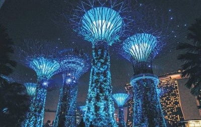 濱海灣花園的擎天大樹今晚披上藍裝,以特別的方式歡慶聯合國日。圖/取自網路