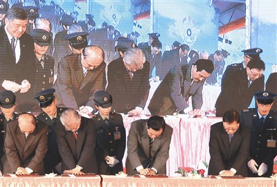 「國家軍事博物館」宣告典禮昨天舉行,馬英九總統(中)和行政院長毛治國(前排左二)等人蓋手模,宣告博物館成立。圖/曾吉松