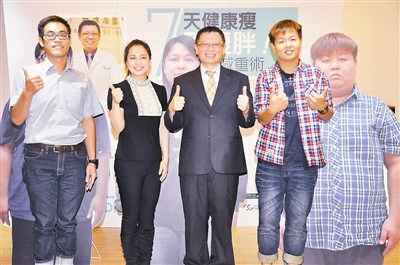 八十年次的小璋(右),成功減重五十公斤,昨與林黑潮醫師(右二)、另外兩名減重案例出席新書發表會,分享減肥心得。
