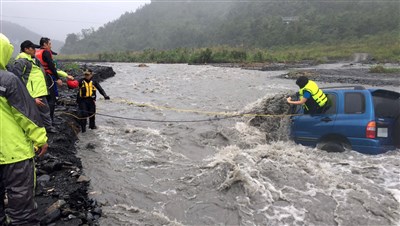宜蘭縣大同鄉清水地熱下游約500公尺處的溪床,昨天在滂沱雨勢中,溪水暴漲湍急,45歲的邱姓男子開著吉普車,載著妻子及4歲兒子出遊,橫渡溪床,不料,車輪深陷泥沙中,動彈不得。
