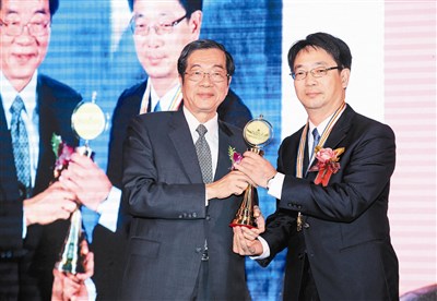澎湖開業醫師李松青(右)獲得個人醫療奉獻獎,由評審團主委黃榮村頒獎。圖/林俊良