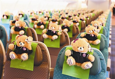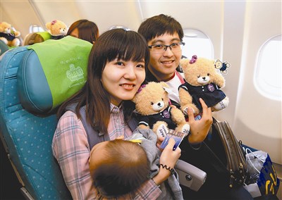 復興航空為因應強勁的日本旅遊需求,昨日起桃園往返東京成田機場航線全面,改由空中巴士A330型客機值勤。慶祝首航,當天清晨七時五十分從桃園出發的首航班機,機艙內被Q版空姐小熊布偶全面攻占,旅客登機時看到興奮地展示手中的戰利品。圖/陳嘉寧