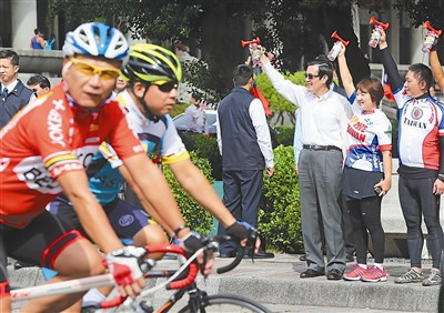 總統馬英九(右二)出席癌友單車環台活動,為車友鳴笛加油。圖/中央社