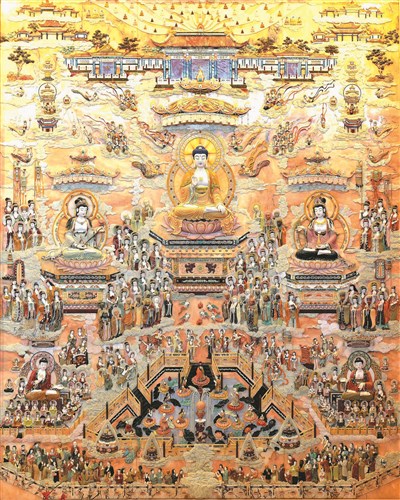 圖中下方,刻製欄楯、羅網、行樹、蓮池及種種奇妙雜色之鳥。池中蓮花綻放,尚有虔誠禮拜的僧侶及在家居士,並雕刻三百八十二尊菩薩、天人、羅漢、飛天、迦陵頻伽鳥以及諸上善人等,充分表現念佛、念法、念僧的西方極樂世界景象,令觀賞者、禮拜者自然心生感動與歡喜。