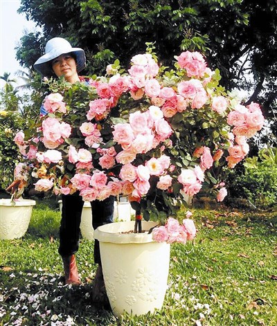 花田村的花貝拉翁淑芳,身體幾乎被完全盛開的樹玫瑰給擋住了。圖/花田村花貝拉提供