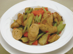 3.起油鍋薑片爆香,加入陳皮及豆豉,再將燙熟的麵腸,西洋芹和辣椒末,入鍋翻炒,用素蠔油、醇米霖、水、白胡椒粉調味。