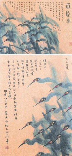 一種是畫面很滿,即所謂的「密不透風」,這種圖像基本上是在吸收西法中做了許多自我的處理,畫面繁雜。多數用色較多,而且色彩濃烈。這一類畫面在表現荷花的作品中,往往以大塊的對比突出主體的荷花,大片的荷葉則以抽象處理,而荷花則是刻劃精細。
