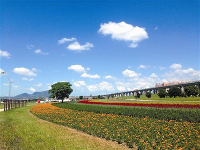 新北市景觀處在二重疏洪道下幸福水漾公園,營造有如日本北海道富良野的花海美景,景觀處自十月上旬以耶誕紅、天使花、孔雀草、矮牽牛、黃金露花、女貞等二十八萬盆植栽,打造綿延約二百公尺的彩虹花海。圖/新北市景觀處提供