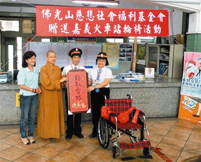 佛光山慈悲社會福利基金會昨捐贈台鐵嘉義車站十台輪椅。圖/台鐵提供