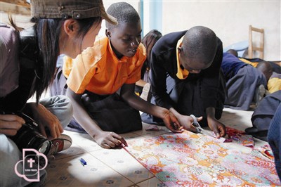 楊怡庭、曾敏婷、張安妤三位年輕女孩發起「Love.Binti—愛.女孩」網路募資,要幫非洲肯亞女孩製作布衛生棉,圖為她們暑假到當地學校指導如何製作。圖/愛女孩提供