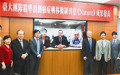 台大植微系副教授沈湯龍(左三)參與美國康乃爾醫學院國際研究團隊(圖中左起日籍研究員Dr. Ayuko Hoshino、指導教授Dr.David Lyden、巴西籍研究員Dr. Bruno Costa-Silva),成功發現癌症轉移的分子機制昨天與台大校長楊泮池(右三)等人舉行成果發表會。圖/侯永全