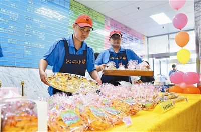 國軍桃園總醫院附設沁心小站庇護餐坊開設已八年,協助身心障礙者習得生活技能,並與社會接軌。圖為他們每日在醫院穿梭,推出好產品給患者享用。圖/賴佑維