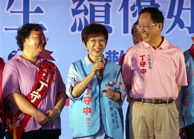 立法院副院長洪秀柱(中)14日在台北出席國民黨立委參選人丁守中(右)競選總部成立大會後表示,對於黨團有意修法廢除證所稅,感到有點遺憾,但也尊重黨團決定。圖/中央社