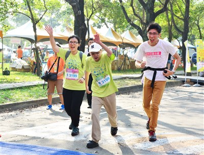 身障青年小安(中)14日在媽媽的陪伴下,通過終點線。圖/中央社