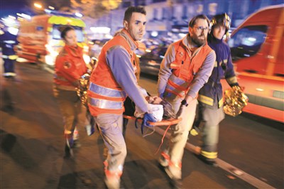 巴黎恐攻造成129死,法國政府全力緝凶,圖為巴塔克蘭劇院槍擊案後,救護人員火速將一名女傷者送醫。圖/美聯社