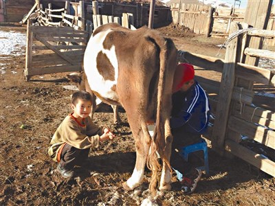 七歲的鋼巴亞爾(左)一直很羡慕哥哥可以幫忙擠牛奶,他卻不行。圖/家扶基金會提供