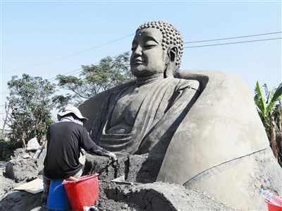 彰化縣田中鎮泥雕藝術節將揭幕,雕塑家正忙著最後階段的泥雕創作。
