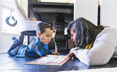 安德蕊(右)用圖文教科書教格蘭特(左)認字,同時練習發音。圖/美聯社