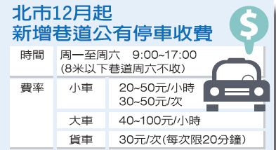 【本報台北訊】台北市12月1日起,全市公有土地路邊停車格都將納入收費管理,交通局希望改善路邊汽車停車格占用情況,並落實使用者付費,最低每小時收20元,或是每次30元。