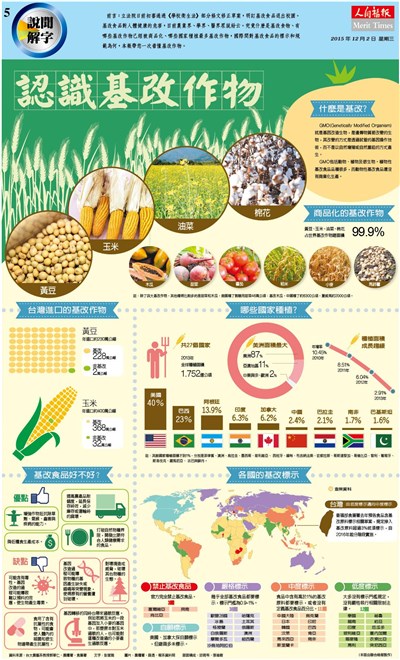 認識基改作物 |2015.12.02 語音朗讀 2307觀看次 字級 大 中 小 認識基改作物 前言:立法院日前初審通過《學校衛生法》部分條文修正草案,明訂基改食品退出校園。基改食品對人體健康的危害,目前農業界、學界、醫界眾說紛云。究竟什麼是基改食物、有哪些基改作物已經被商品化、哪些國家種植最多基改作物,國際間對基改食品的標示和規範為何,本報帶您一次看懂基改作物。 前一篇文章 巴拿馬運河101年 下一篇文章 新移民 心世界 熱門新聞 01【閃文集】火星暗斑之謎2025.12.1602【詩】草螟公2025.12.1803【為人父母】 允許如其所是2025.12.1504【詩】 航夢2025.12.1505東方微笑跨越千年 麥積山石窟現佛館2025.12.1506寶塔寺 三代同堂搓湯圓、繪燈籠2025.12.1607人間佛教在菲律賓2025.12.1408如何優雅不濺水花?2025.12.1609佛光山福國寺 獲頒台南市宗教績優團體獎2025.12.1510高雄新航線明啟動 佛光山成亮點2025.12.17 訂閱電子報 台北市 天氣預報 台灣一週天氣預報 相關報導 大學校名怎麼來? 作者其他文章優化大腦 自我實現心理投射現象解析從潮流到商機 流行文化吸引力困境中從容轉身莫迪會見普亭 盼俄烏戰爭盡快落幕面對災厄無常 善念可化解與修復